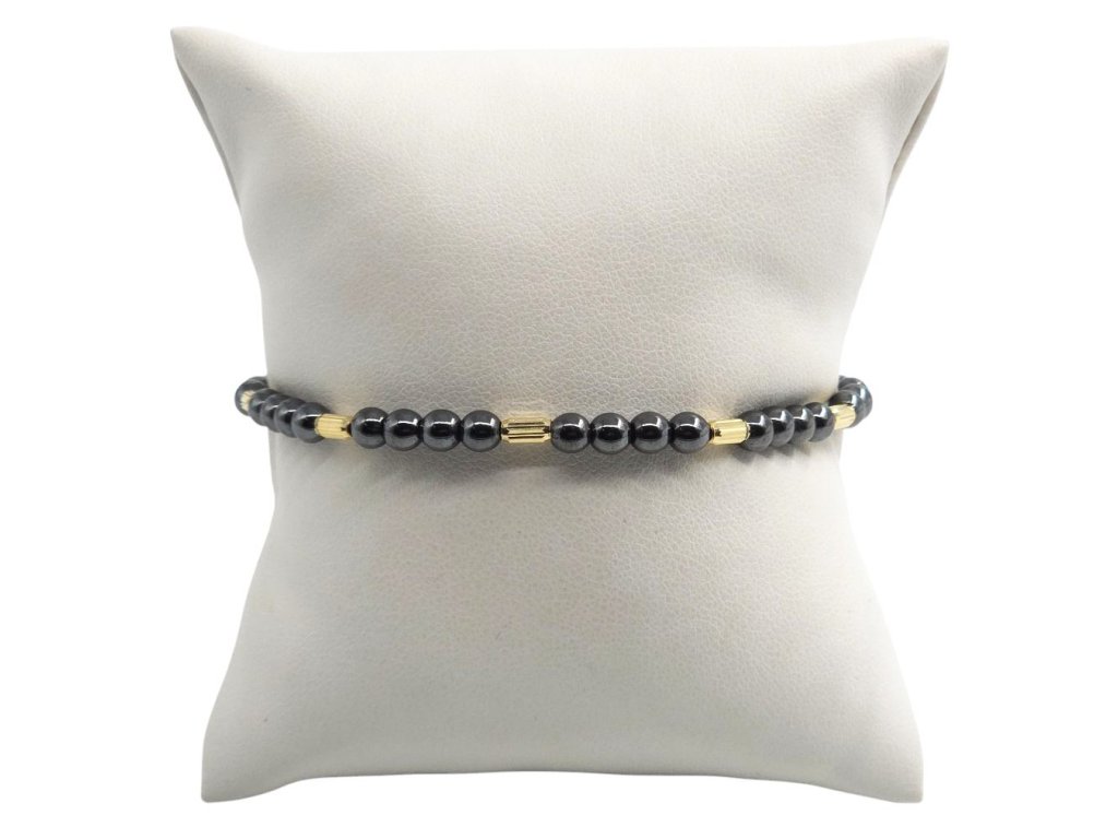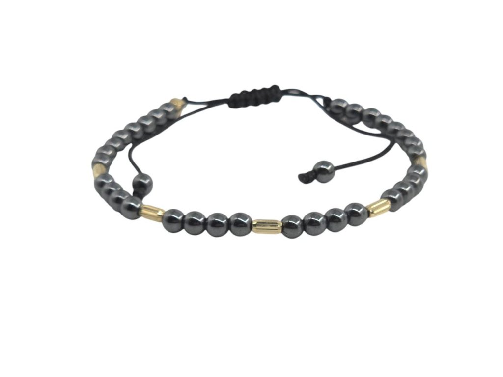 Náramek - hematit a zlaté válečky, černá šňůrka, 6,75 g, Au 585 0,45 g