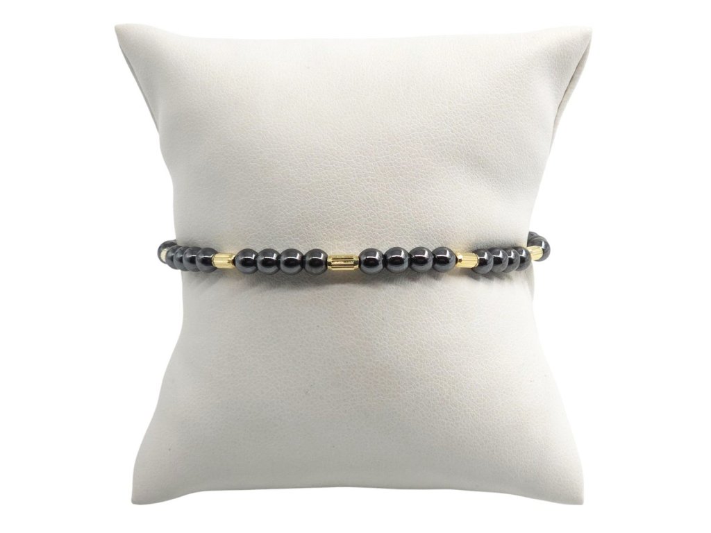Náramek - hematit a zlaté válečky, černá šňůrka 6,01 g, Au 585 0,45 g