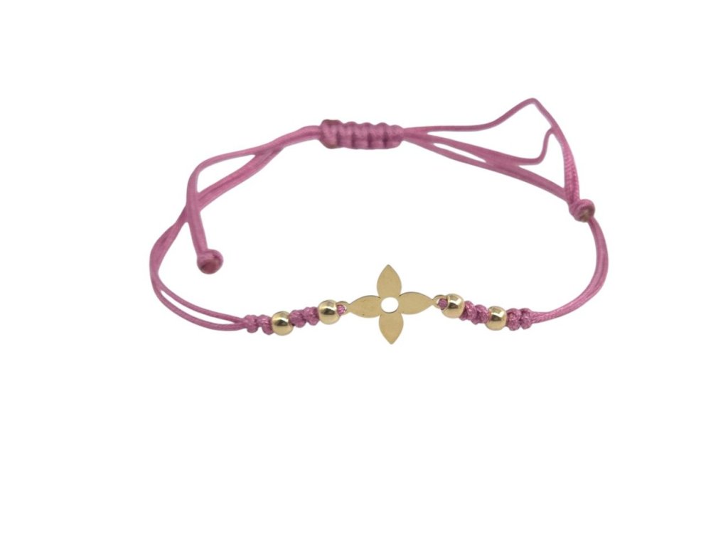 Náramek - květ a zlaté kuličky, růžová šňůrka 0,77 g, Au 585 0,45 g