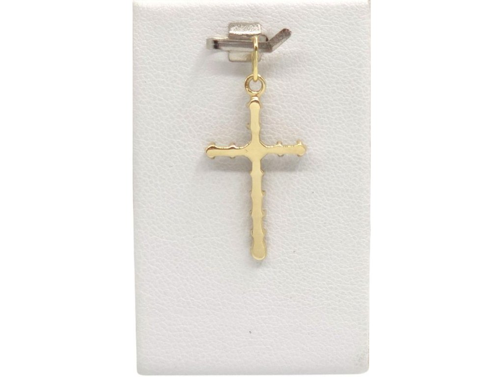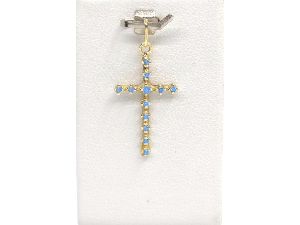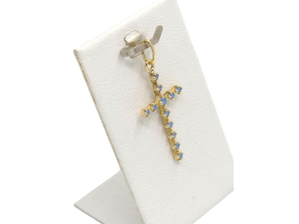 Přívěšek ze žlutého zlata - křížek s modrými kamínky