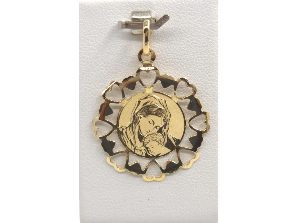 Přívěšek ze žlutého zlata - Madonka v kolečku, se srdíčky na obvodu