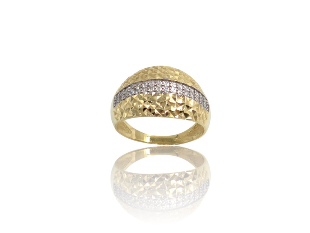 Prsten ze žlutého zlata, gravírovaný, osazený zirkony, zdobený bílým zlatem