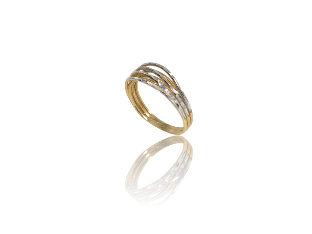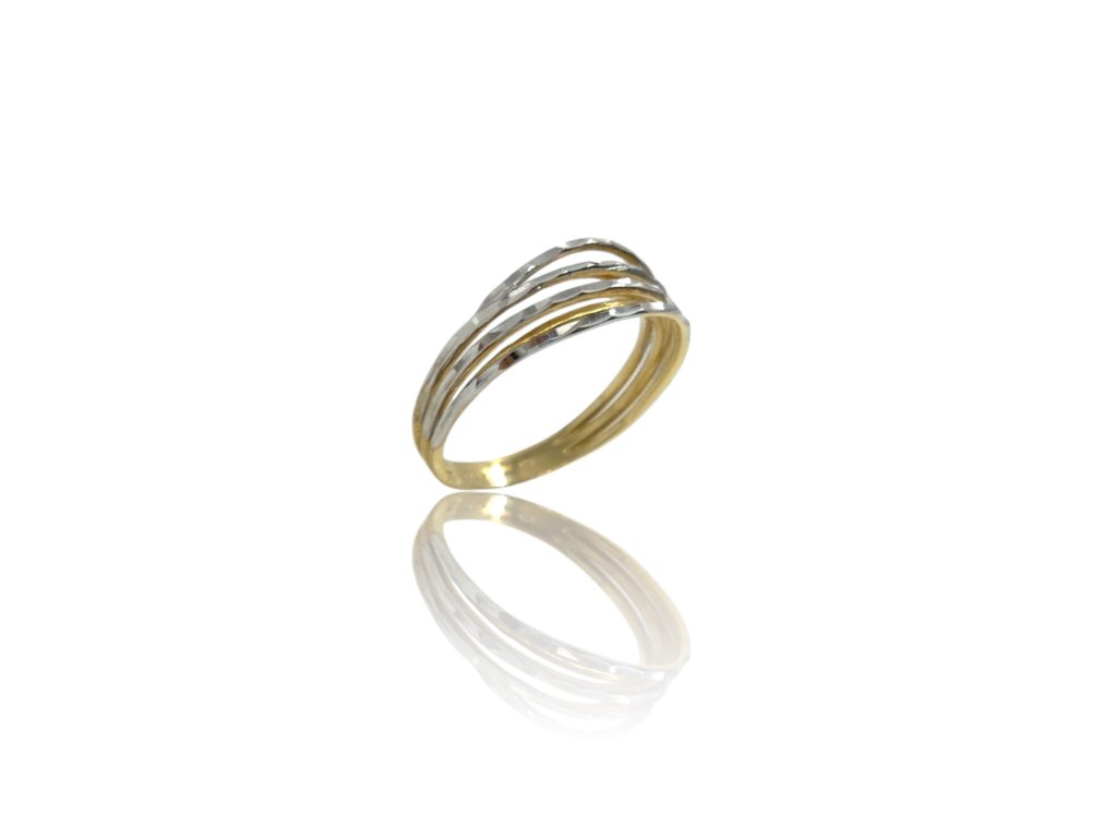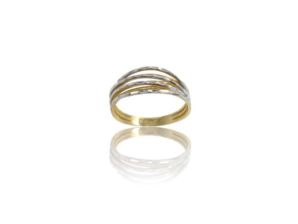 Prsten ze žlutého zlata, zdobený gravírovanými polokruhy z bílého zlata