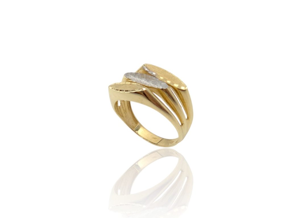 Prsten ze žlutého zlata - 3 spojené a natočené prsteny, zdobené bílým zlatem a gravírováním