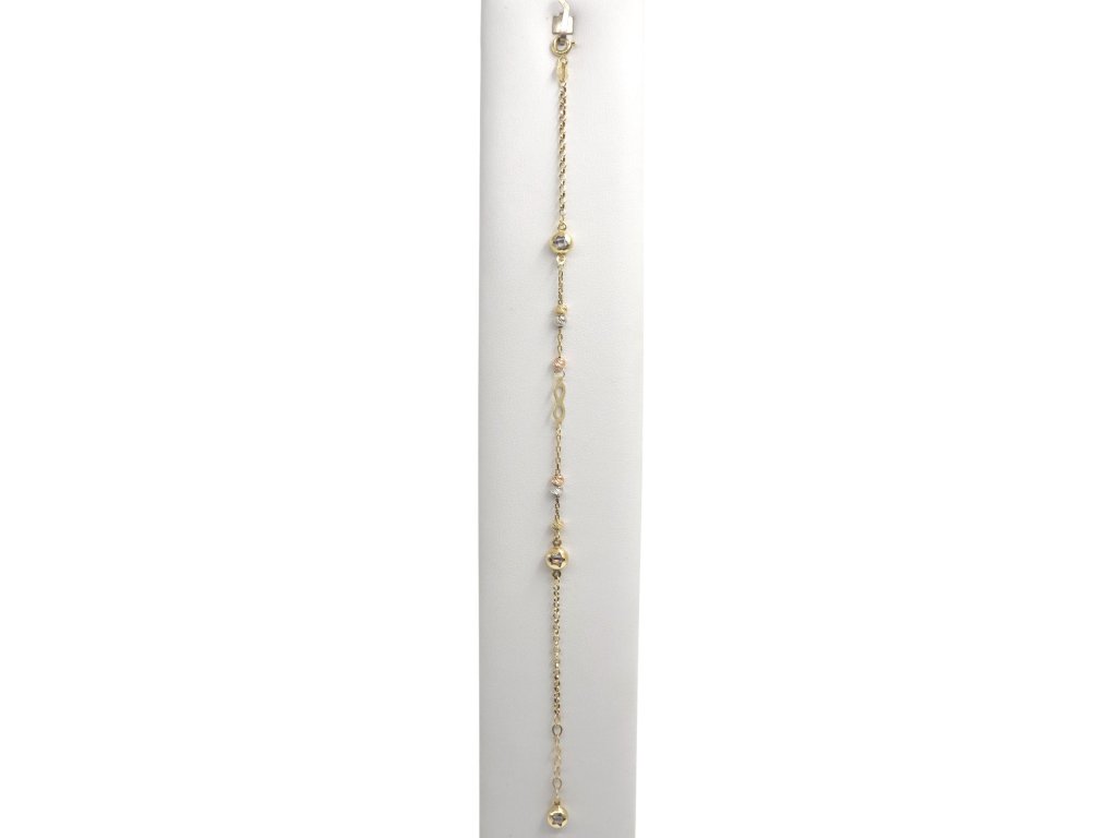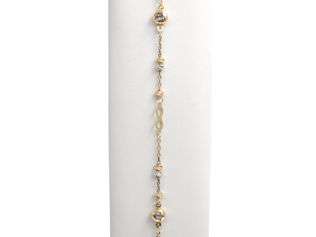 Náramek ze žlutého zlata - Rolo a ankr, nekonečno a kuličky ze žlutého, růžového a bílého zlata, zdobený zirkony