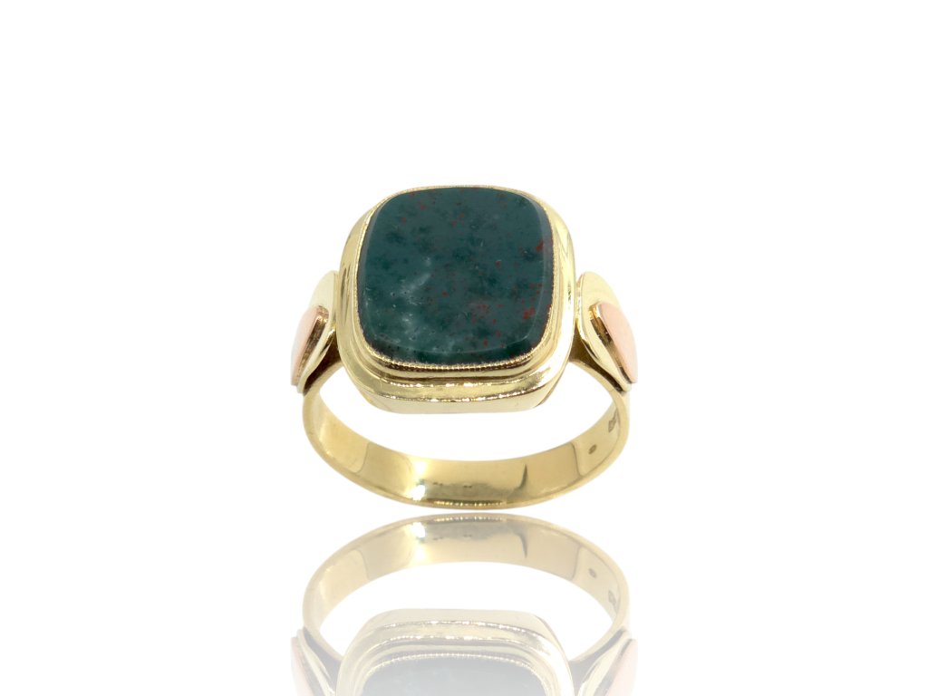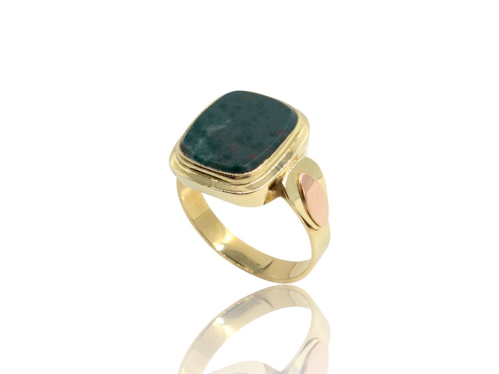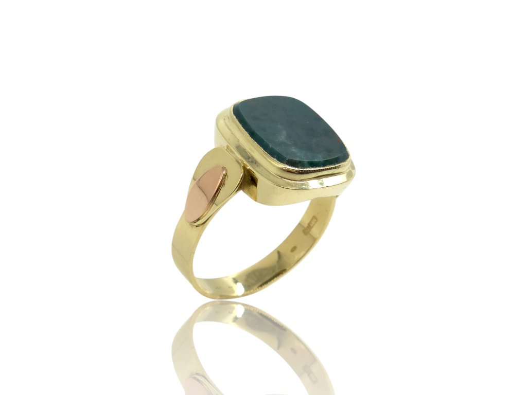 Výrazný pánský prsten ze žlutého zlata zaujme dominantním kamenem v sytě zeleném odstínu s jemnou přírodní kresbou. Kámen je zasazen do hladké, pevné obruby, která podtrhuje jeho charakter a dodává šperku luxusní vzhled. Zajímavým detailem je kontrastní prvek v růžovém tónu na boční straně prstenu, který celkovému designu dodává originalitu a osobitost. Masivnější konstrukce působí sebevědomě a elegantně zároveň. Ideální volba pro muže, kteří hledají výrazný, ale vkusný doplněk s jedinečným charakterem.