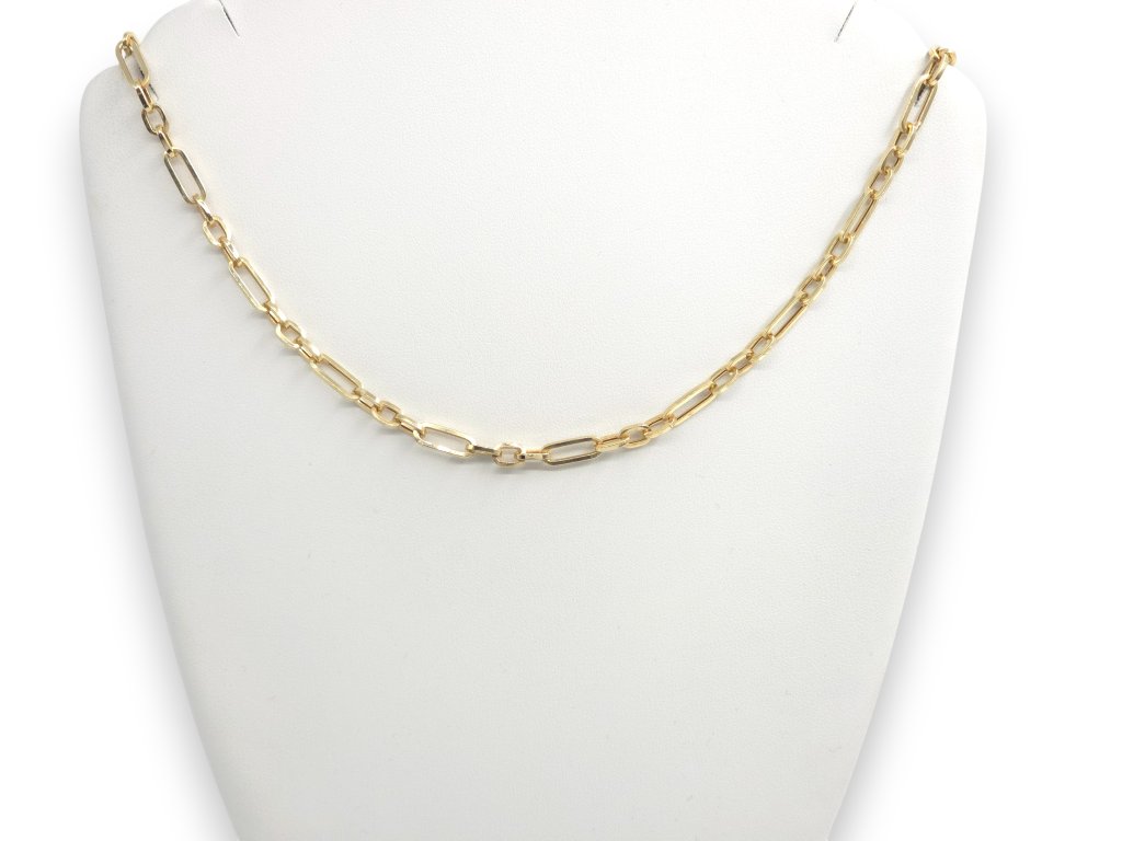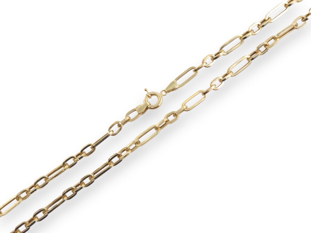 Výrazný zlatý řetízek s podlouhlými články zaujme svým moderním a lehce industriálním vzhledem. Kombinace delších oválných oček a jemnějších spojovacích článků vytváří dynamický, elegantní celek. Díky pevné konstrukci a klasickému pérovému zapínání je ideální pro samostatné nošení i jako základ pro výraznější přívěsek. Skvělá volba pro ženy i muže, kteří preferují současný styl s charakterem. Odlehčená verze.
