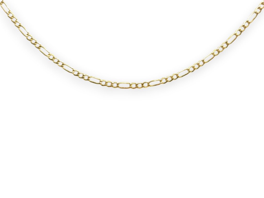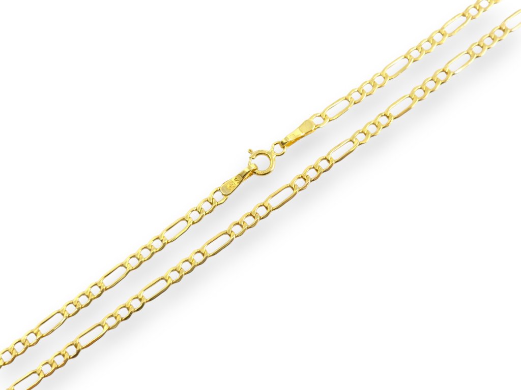 Zlatý řetízek ze žlutého zlata v klasické Figaro vazbě, charakteristické pravidelným střídáním kratších a delších oválných článků. Leštěný povrch zajišťuje vysoký lesk a elegantní vzhled. Řetízek působí výrazněji, je vhodný pro samostatné nošení i jako stylový doplněk k přívěsku. Opatřen bezpečným pérovým zapínáním. Odlehčená verze.